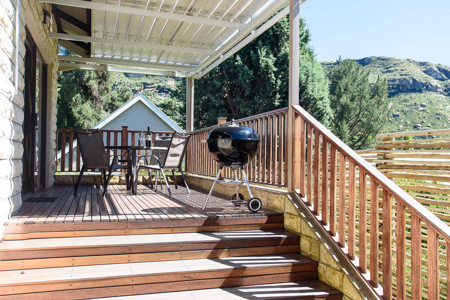 Each unit has a fully equipped kitchenette with oven, fridge and microwave. The lounge has a flat screen TV with DStv Guesthouse bouquet and a fireplace. Each unit also has secure shaded parking for two vehicles.